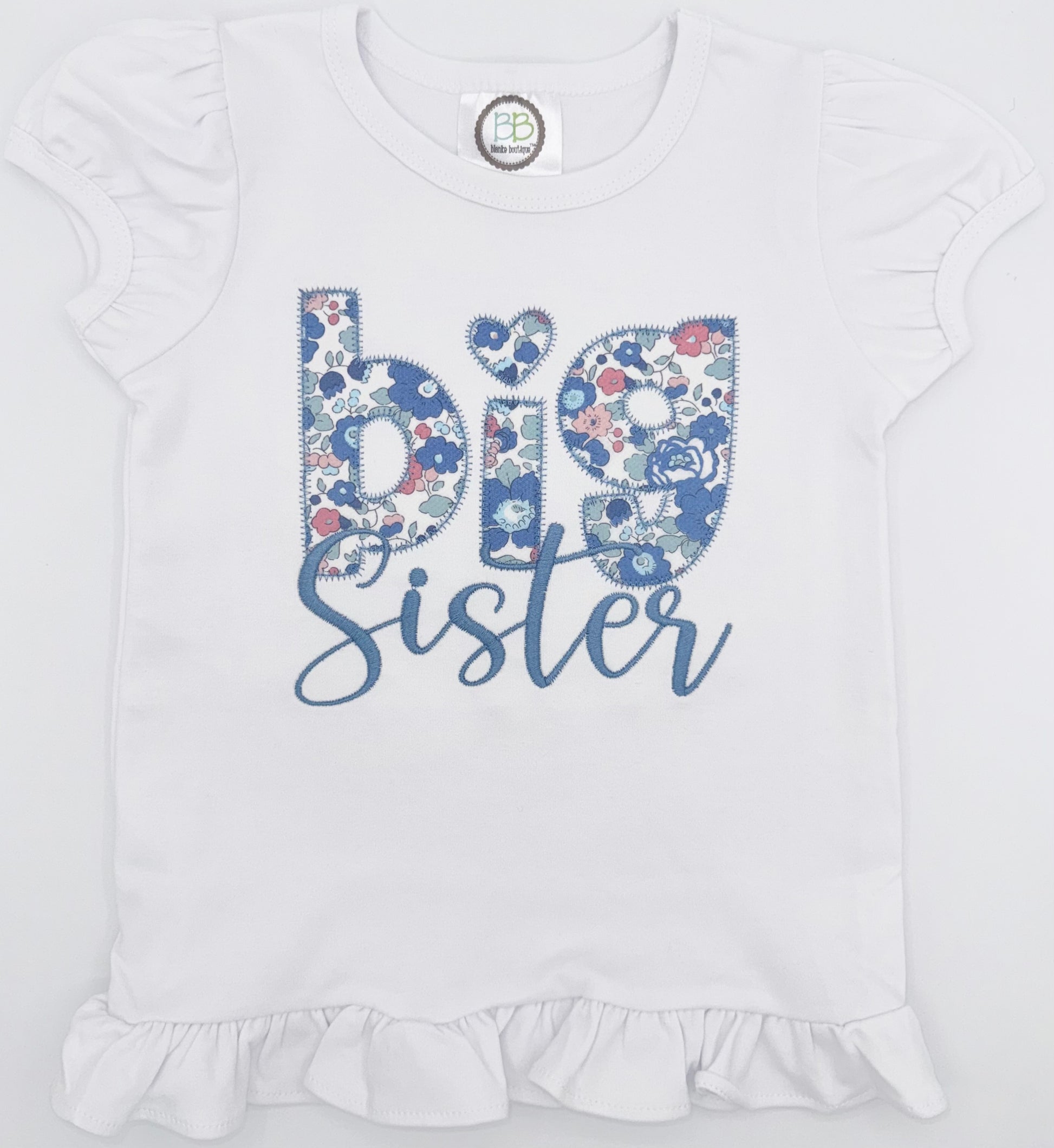 Blue Floral Girls Big Sister Shirt or Dress – Custom Ruffle Tee with Blue Floral Appliqué – Personalized Sister Shirt | Dress Option