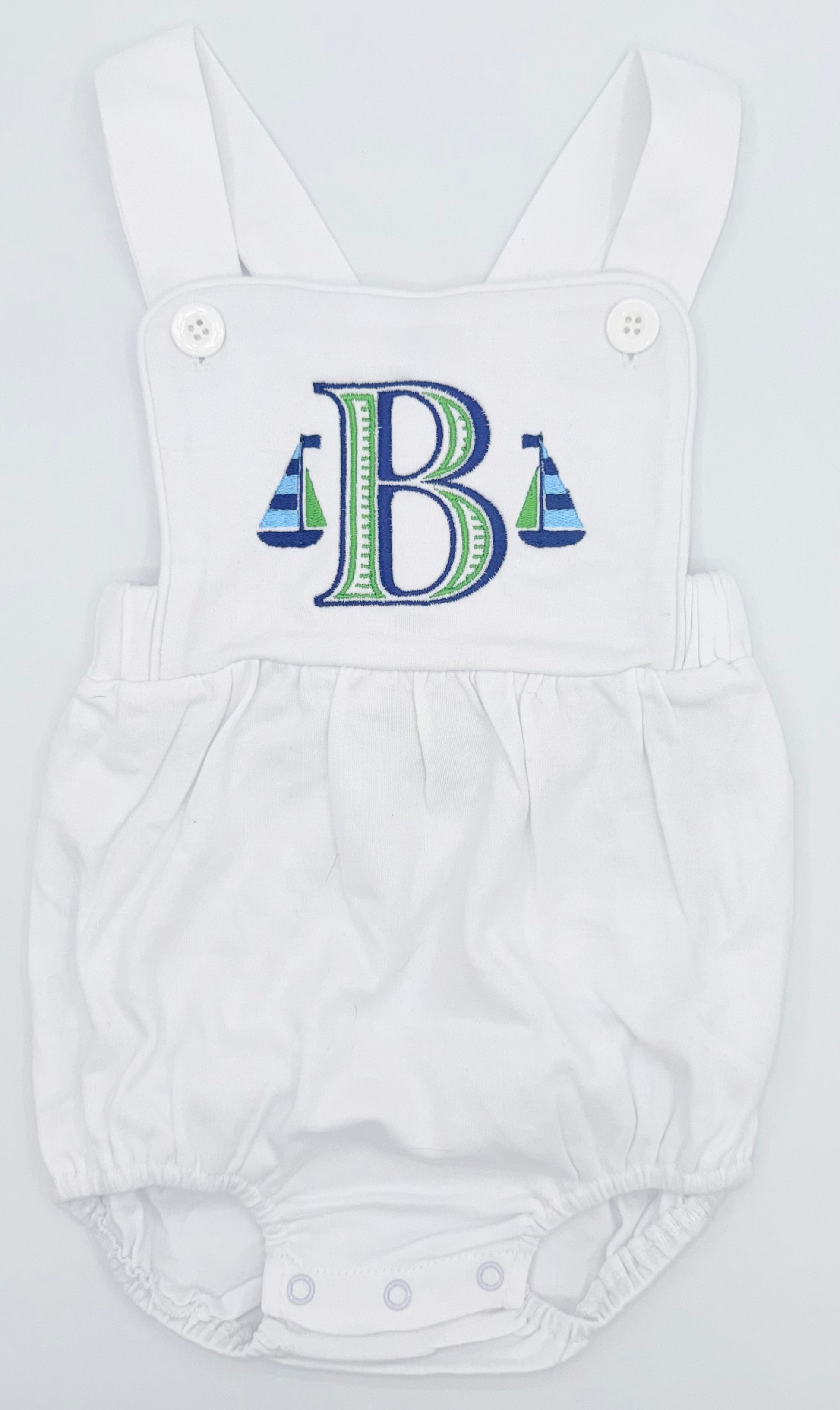 Embroidered Sail Boat and Initial Boy’s Sunsuit, Baby Boy Toddler | Bubble, Boy Outfit, Summer, Romper, Boats, Custom, Bold, Blue and Green
