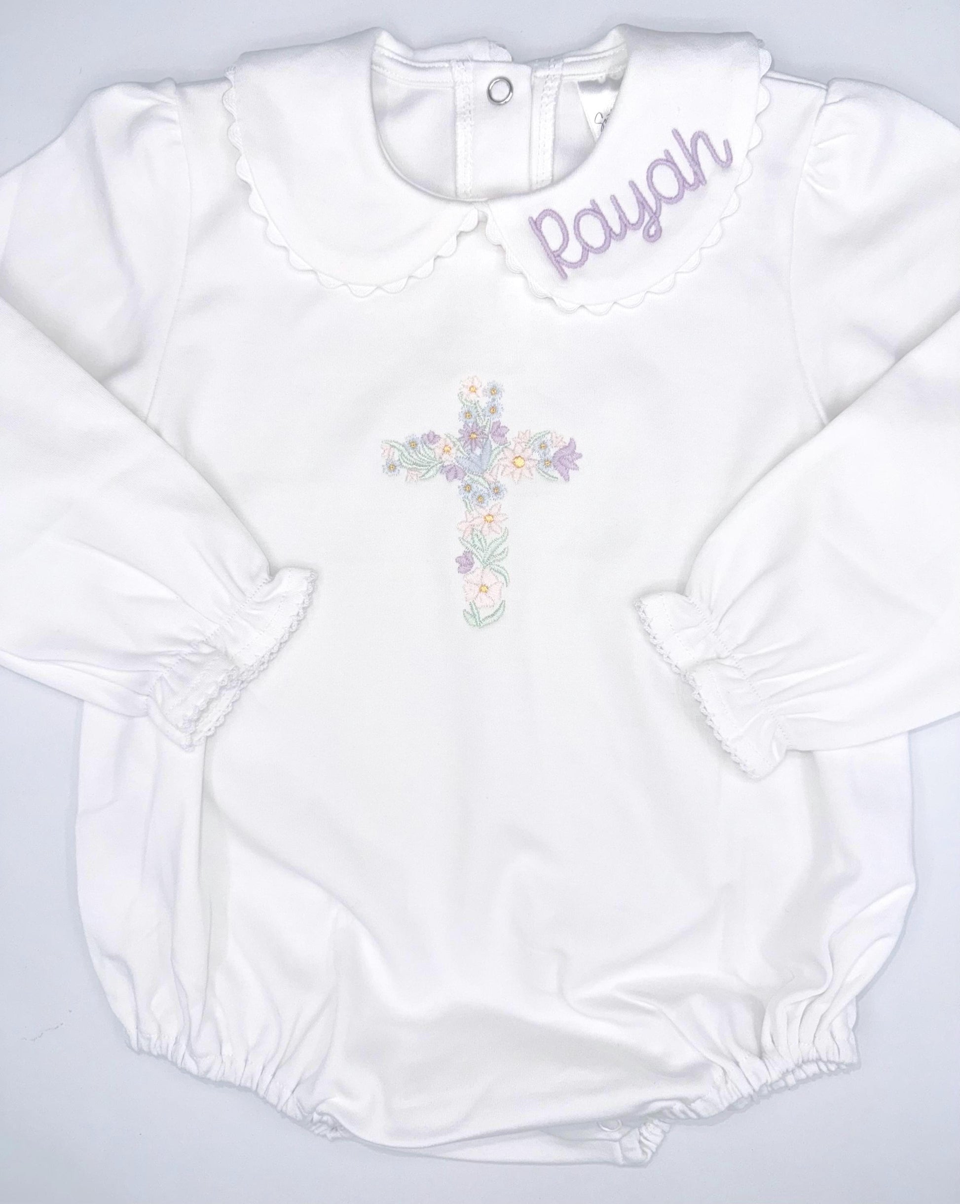 Embroidered Floral Cross on Scallop Edge Long Sleeve Bubble, Romper, Collar Embroidery, Monogram, RicRac, Customize, Easter Outfit, Church
