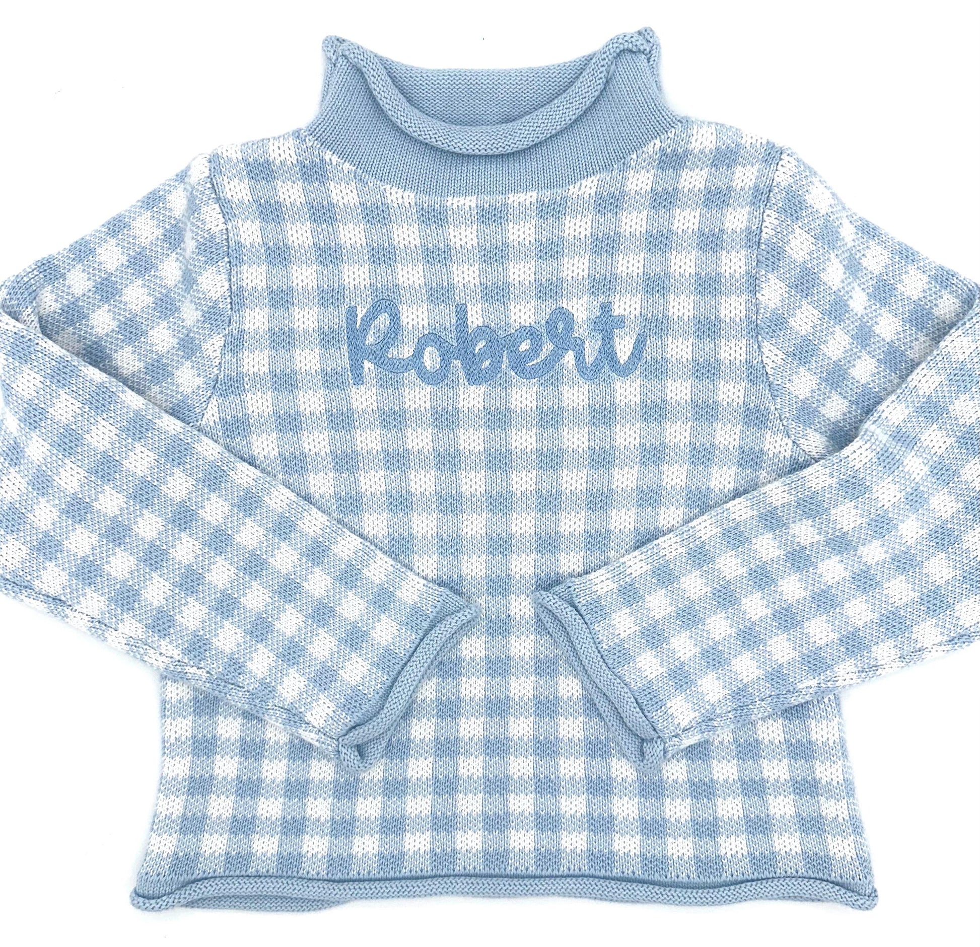 Personalized Blue Gingham Rollneck Sweater, Baby Toddler Boy Girl | Winter Clothes, Sweater, Customize, Embroidered, Every day wear