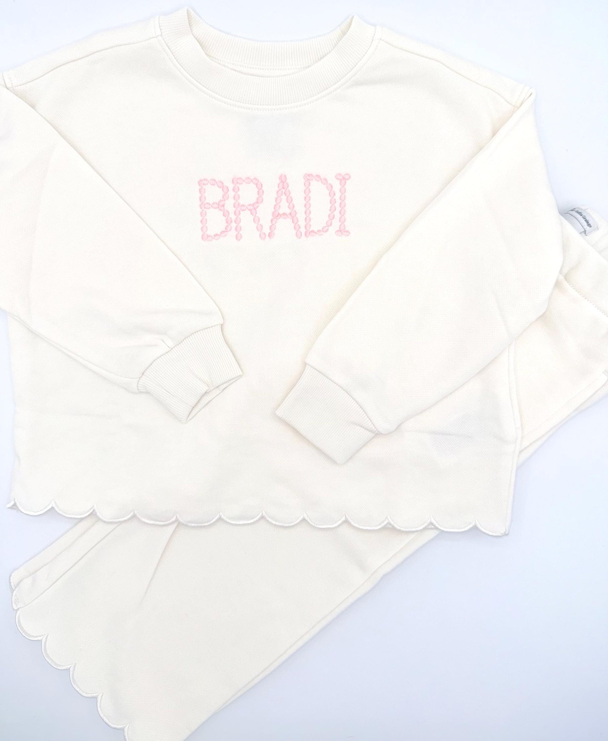 Personalized Ivory Scallop Lounge Set | Custom Kids Outfit, Embroidered Outfit, Personalized Pants Set