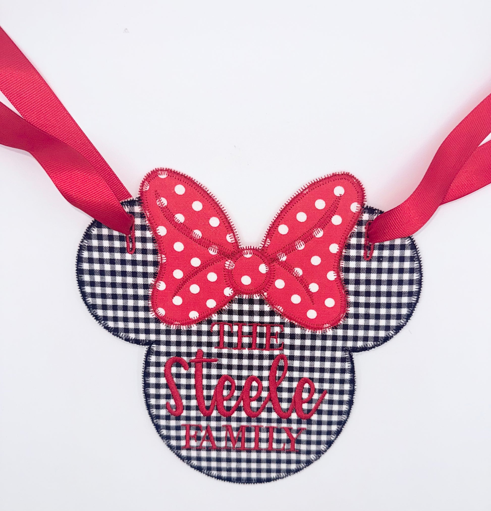 Personalized Gingham Mouse Head Stroller Tag | Polka Dot Bow | Red | Black | White