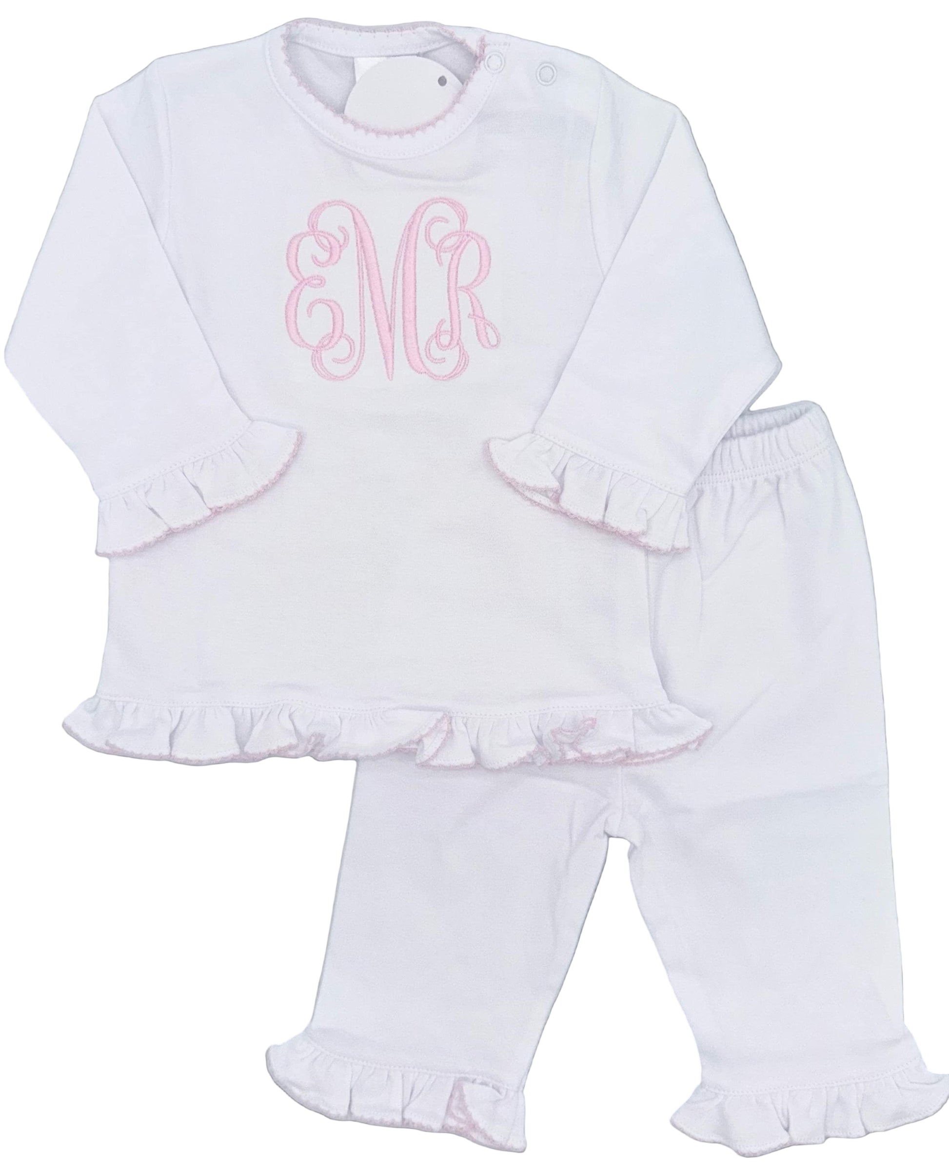 Personalized Solid Ruffle 2 Piece Outfit, Baby Toddler Girl | Pima Cotton Ruffle Pant Set, Pink Picot Trim, Personalize, Embroidery, Custom