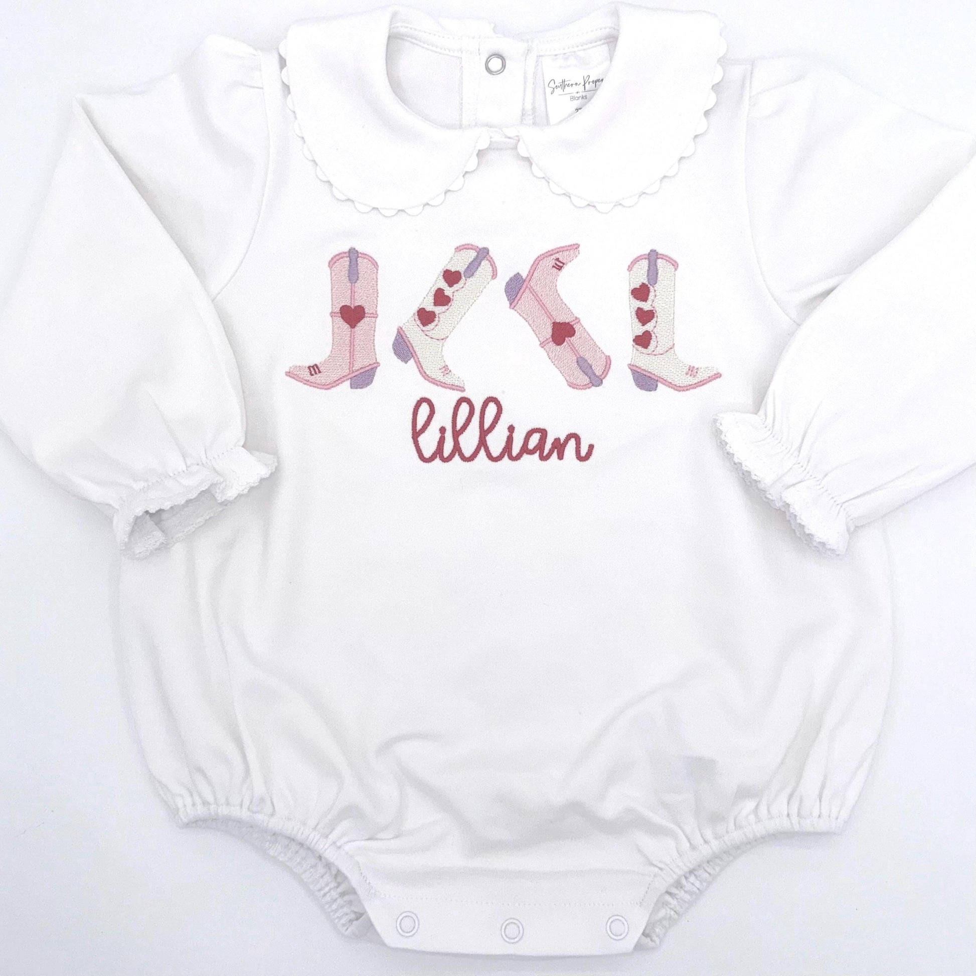 Personalized White Scallop Edge Bubble Valentine’s Cowgirl Boots, Hearts, Romper, Peter Pan Collar, Customize, Embroidery, Pink, Red