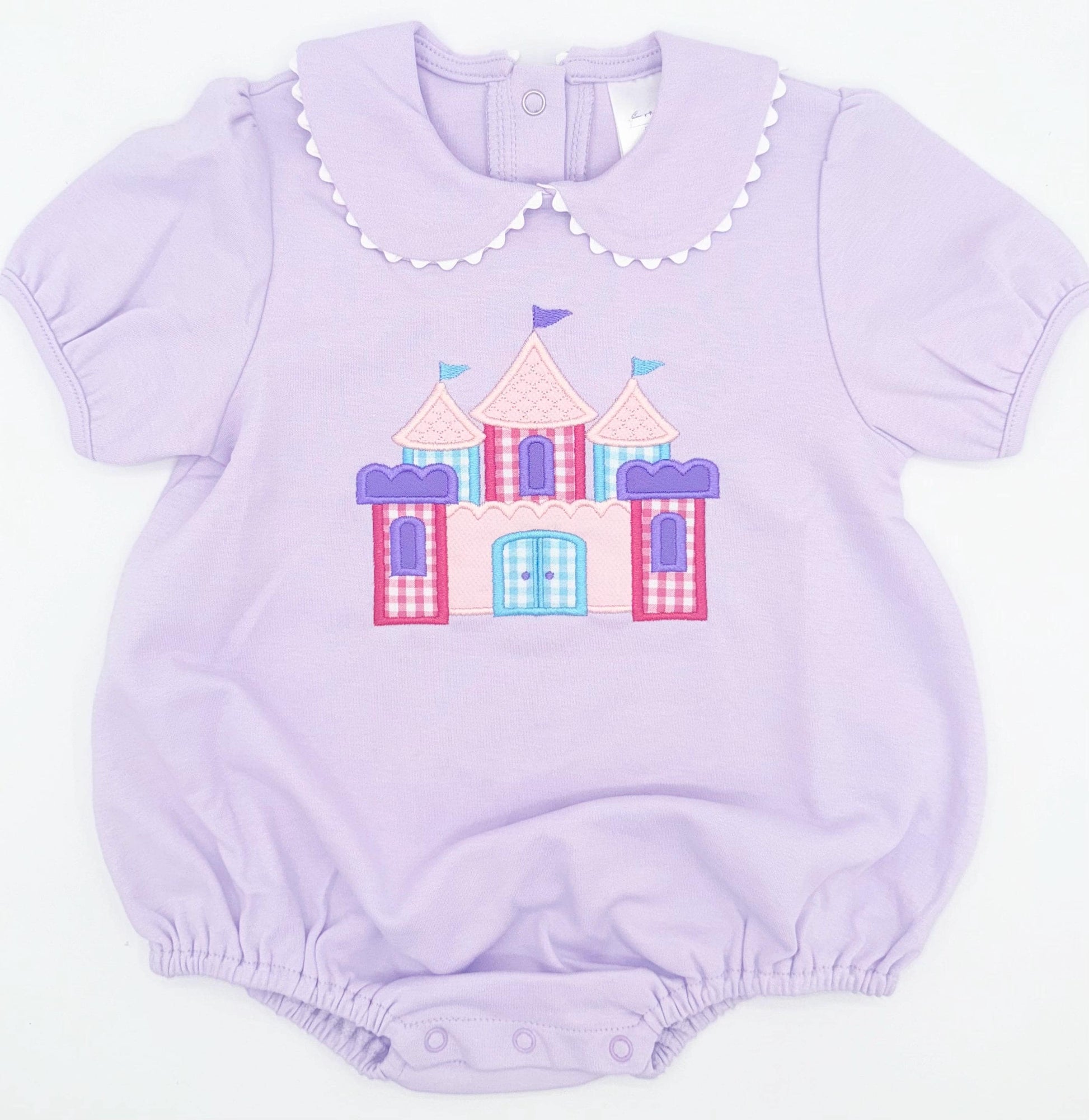 This sweet bubble outfit features a castle appliqué adding a touch of magic to any little one's wardrobe. Perfect for sunny days and special moments! This bubble combines comfort with whimsical style for your little princess to shine.
