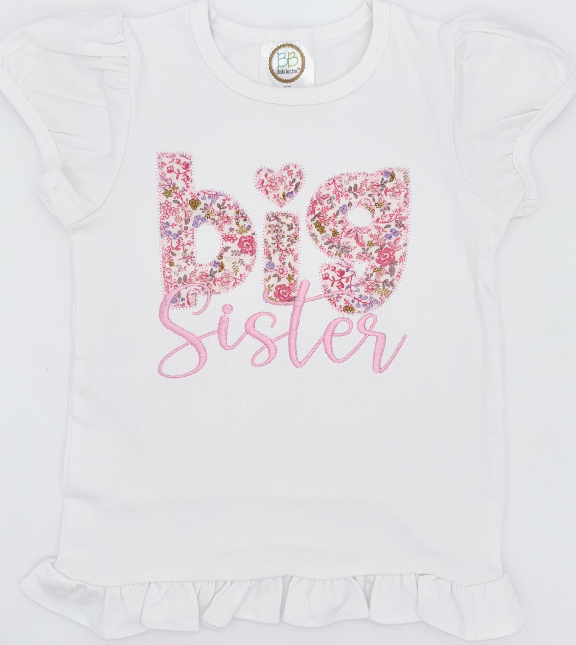 Girls Big Sister Shirt or Dress – Custom Ruffle Tee with Floral Appliqué – Personalized Sister Shirt | Dress Option